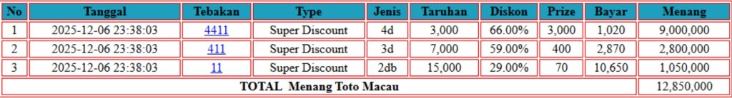 Selamat kepada User ID AL*** telah mendapatkan kemenangan besar di TOGEL { TOTO MACAU } Rp. 12.635.000 LUNAS dan SAH !!!