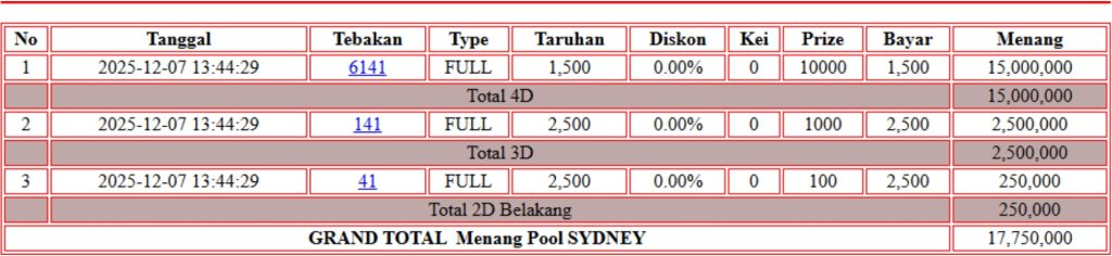 Selamat kepada User ID AST*** telah mendapatkan kemenangan besar di TOGEL { SYDNEY } Rp. 17.500.000 LUNAS dan SAH !!!
