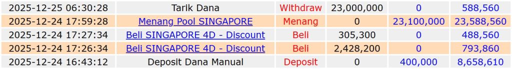 Selamat kepada User ID CA*** telah mendapatkan kemenangan besar di TOGEL { SINGAPORE } Rp. 23.000.000 LUNAS dan SAH !!!