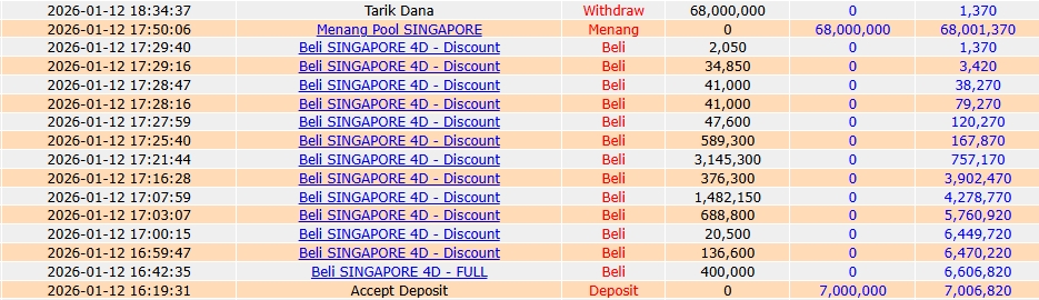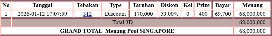 Selamat kepada User ID CAT*** telah mendapatkan kemenangan besar di DI TOGEL { SINGAPORE} Rp. 68.000.000 LUNAS dan SAH !!!