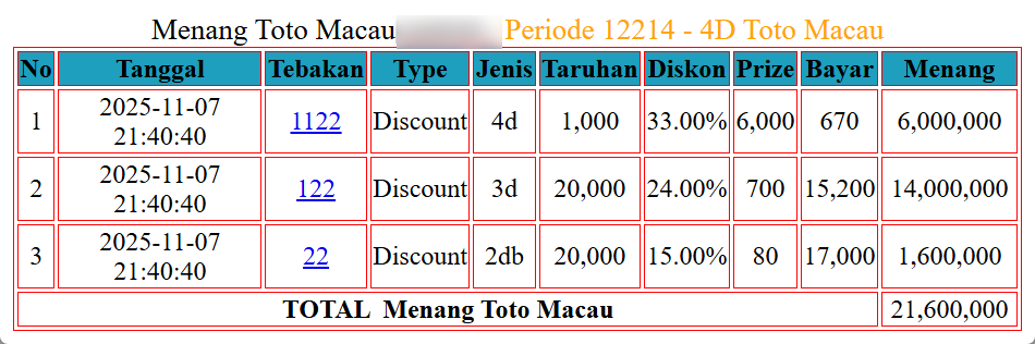 Selamat kepada User IDΒ JAN*** telah mendapatkan kemenangan besar di TOGEL { 4D TOTO MACAU } 18 700.000 Β LUNAS dan SAH !!! ποΈ