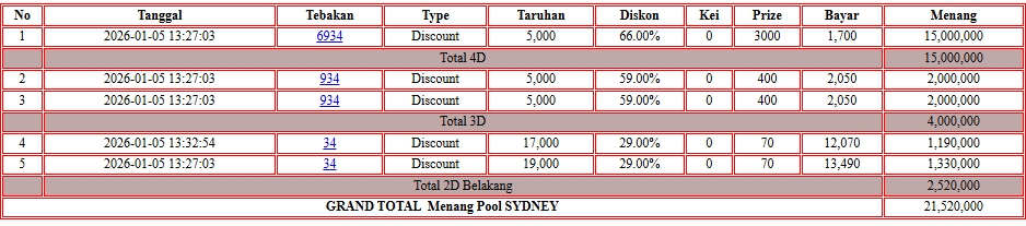 Selamat kepada User ID NAR*** telah mendapatkan kemenangan besar di DI TOGEL { SYDNEY} Rp. 21.000.000 LUNAS dan SAH !!!