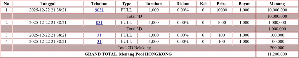 Selamat kepada User ID PON*** telah mendapatkan kemenangan besar di TOGEL { HONGKONG } Rp. 11.000.000 LUNAS dan SAH !!!