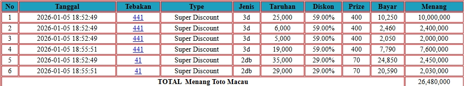 JACKTOTO adalah platform togel yang unggul dalam transparansi dan keandalan, menyediakan bukti jackpot terverifikasi yang menjamin keamanan setiap kemenangan membernya. Dengan sistem pencatatan dan pelaporan yang canggih, JACKTOTO memastikan bahwa setiap kemenangan dicatat secara akurat dan dibayar penuh tanpa penundaan. Data bukti jackpot yang tersedia di JACKTOTO dapat diakses dan diverifikasi oleh anggota, memberikan rasa aman dan kepercayaan bahwa setiap klaim kemenangan diolah dengan adil. Komitmen JACKTOTO terhadap kejujuran dan integritas menjadikannya pilihan utama bagi pemain togel yang mengutamakan keamanan dan kepastian dalam setiap taruhan.